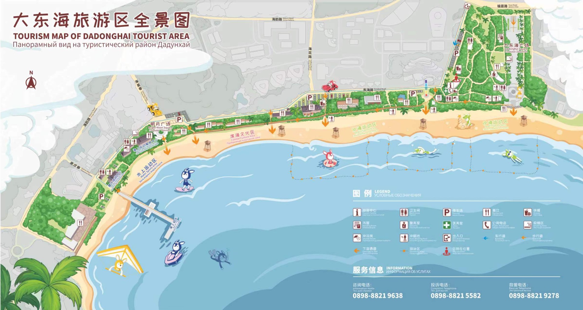Туристическая зона разделена на семь функциональных зон: зона экологического сохранения, зона культурного опыта, зона морских видов спорта, зона отдыха и питания, зона пляжного спорта, зона обслуживания туристов и городская парковая зона, удовлетворяя разнообразные потребности жителей и туристов. Одновременно, руководствуясь дизайнерской философией «Модно, Визуально, Наслаждение, Свобода, Опыт», в зоне активно проводятся мероприятия по трансформации и повышению качества. Среди существующих брендов и предложений в зоне — пляжный бар-ресторан IPK и бар Lan (ориентированные на Finns и Labrisa с Бали), итальянское мороженое ручной работы Carpigiani и кафе One Step Garden, бар Freegen, кросс-бордер электронной коммерции FunBuy, ресторан-бар Malt, бар Dabao, и «Toucan», представительный местный бренд Саньи для отечественного дуриана. Также представлены известные новые потребительские бренды, такие как Luckin кофе, KFC и Lawson мини-маркет, а также 57 местных известных брендов, таких как Donghai Longgong, Wu Hu Xuan и Sihai Jing. Кроме того, в сотрудничестве с выдающимся частным предприятием Саньи, компанией Учжичжоу, управляется парк водных видов спорта Дадунхай, предлагающий 18 классических развлечений на воде, занятий дайвингом и учебных программ, удовлетворяя потребности разных возрастных групп в модных водных видах спорта.